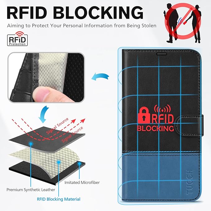 - Highlights: (1). It is supported by advanced RFID blocking technology to block signals and protect your personal information effectively. (2). Can stand the phone up to watch something hands-free. (3). Magnetic flap to keep it closed and protected, secure magnetic closure