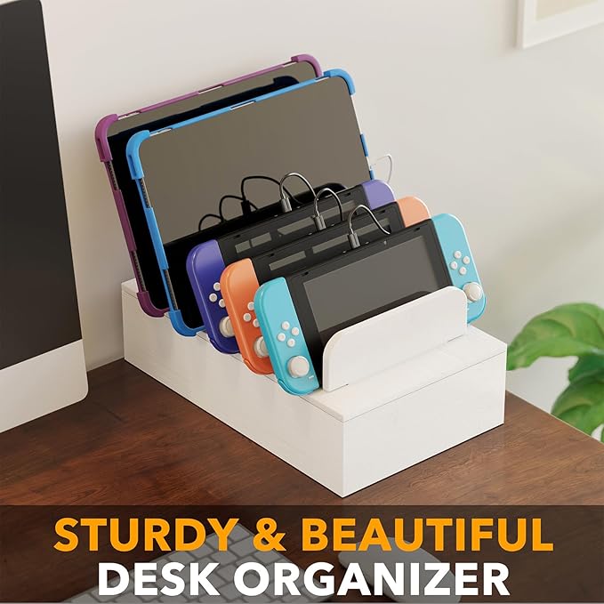 - 5 IN 1 DESIGN WHITE STATION - With the 6 dividers, this cell phone charging station holds up to 5 multi devices; The dividers even have two heights to fit diffenrent bedside nightstand organization needs