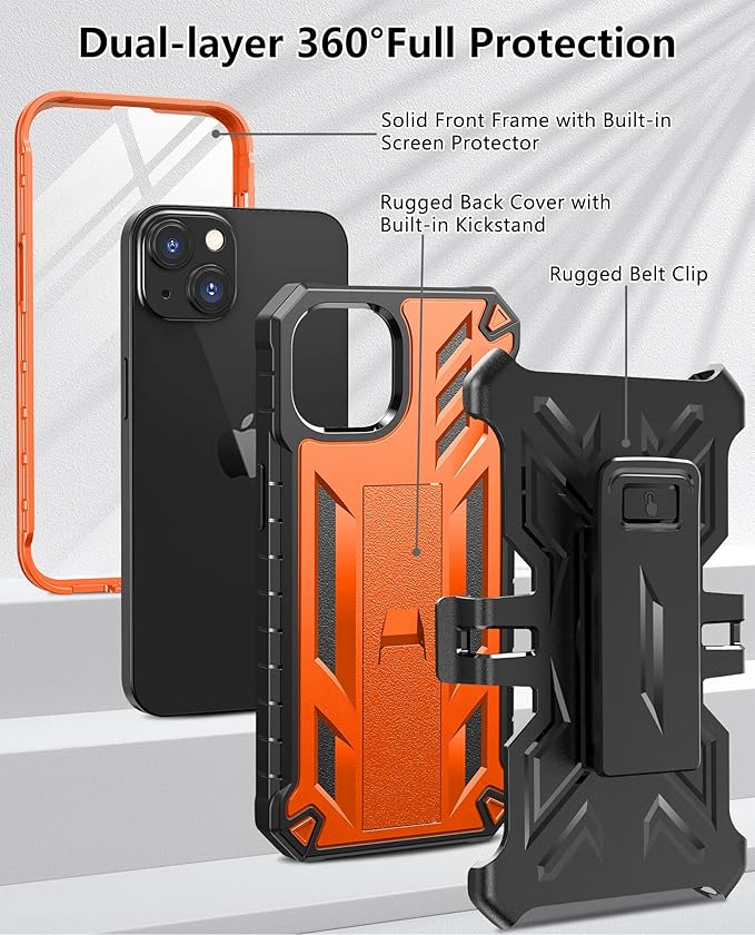 for iPhone 13/14 Protective Case: for iPhone 16e Cover with Belt Clip Holster | Durable Dual-Layer Design with Built-in Kickstand | Heavy Duty Military Grade Hard Protection Shock Proof Orange