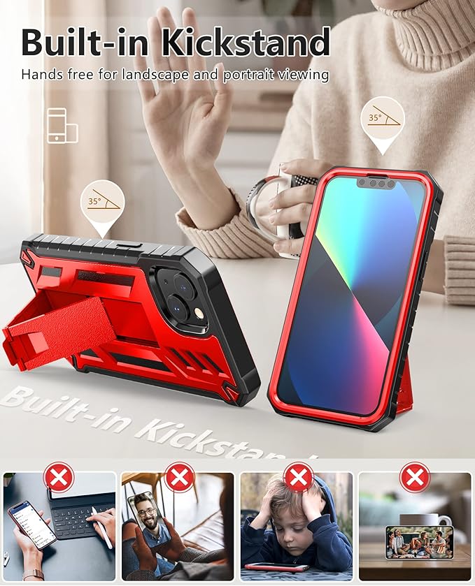 - Built-In Kickstand: This iPhone 13/14/16e Case with stand works perfectly both in vertical and horizontal positions. Convenient for reading,watching movies,playing games,browsing the web and face-to-face chatting with friends.Provides hands-free portrait and landscape viewing angles