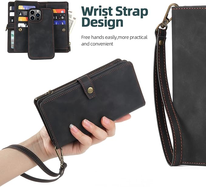 TwoHead for iPhone 13 Pro Wallet Case with Card Holder,Detachable Magnetic 13 Pro Phone Case, PU Leather Shockproof Protective Cover Wallet for Women/Men,with Wrist Strap(Dream Black)