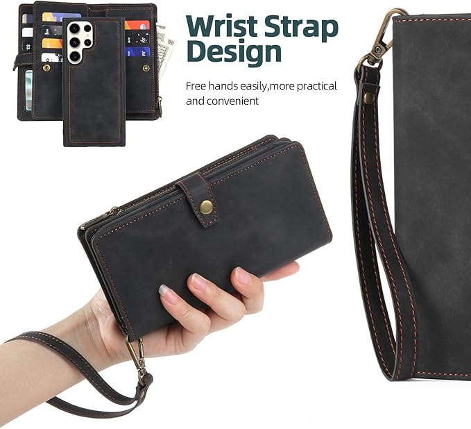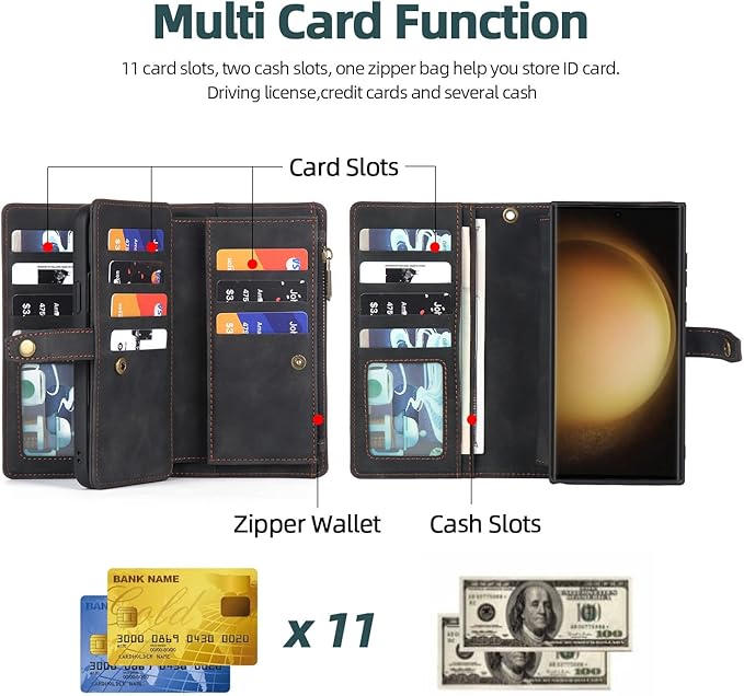 - 【Multi Card Slot Design】 TwoHead for Samsung Galaxy S23 Ultra case wallet with 11 card slots,2 cash slots and 1 zipper pocket,there's plenty of room in it for your ID card ,driver license,credit cards,bills,coins and a small amount of cash,which let you keep the essentials organized well.It's a good choice for traveling, shopping and partying.