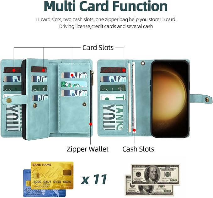 - 【Multi Card Slot Design】 TwoHead for Samsung Galaxy S23 case wallet with 11 card slots,2 cash slots and 1 zipper pocket,there's plenty of room in it for your ID card ,driver license,credit cards,bills,coins and a small amount of cash,which let you keep the essentials organized well.It's a good choice for traveling, shopping and partying.