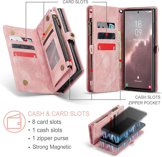 - 【Multi-Function】This Galaxy S23 Ultra case with card holder offers 8 card slots for credit cards, ID, business cards and 1 cash slots for cash , a zipper pocket for receipt and bills .