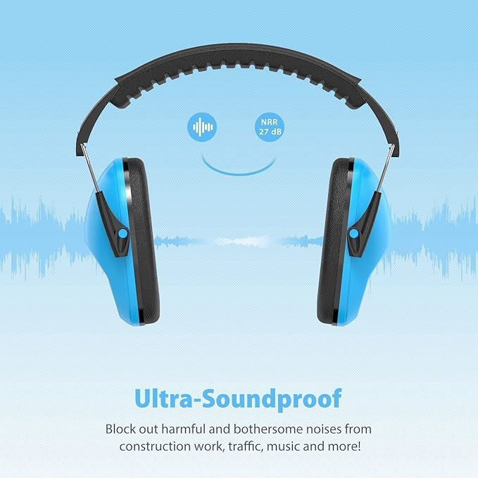 - 【Adjustable Headband to Fit All】: The headband of the noise cancelling headphone for kids can smoothly adjust to fit different head sizes, from toddlers and children to teenagers and even adults. Tips: If you feel the earmuff is too tight when you use it for the first time, you can put it on the package box (or size 3 soccer ball) for 4 hours to loosen it.