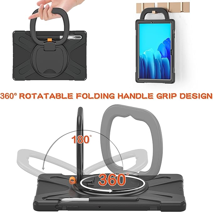 360 Rotation Portable Case for Galaxy Tab S8+/S7 FE/S7+ 12.4 Inch Case with S Pen Holder Rugged Case Rotating Stand Hand Strap Shoulder Carrying Strap Outdoor Cover (Black)