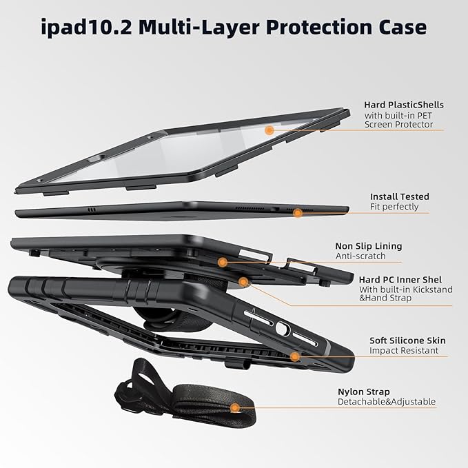 - 【Detachable & Adjustable Shoulder Strap】Attach the strap to any two corner holes of this iPad 10.2 Case.Carry your iPad conveniently wherever you are at home, at work,or on a trip.You can also hang it behind the headrest of the car seat for shared viewing.