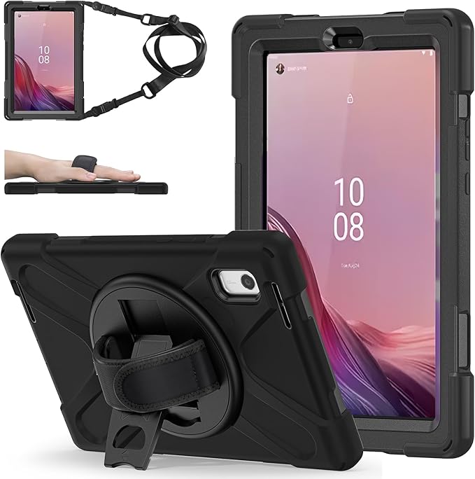 - FEATURES: ① Built-in Kickstand is 360 degree rotating, you can adjust your Lenovo Tab M9 to whatever angle you want, perfect for watching videos and chatting; ② Adjustable velcor hand strap allows big hand and small hand, perfect for kids and adults. ③ Adjustable and detachable Shoulder belt is very convenience, safe and fashion you can carry your tablet with should belt wherever you want