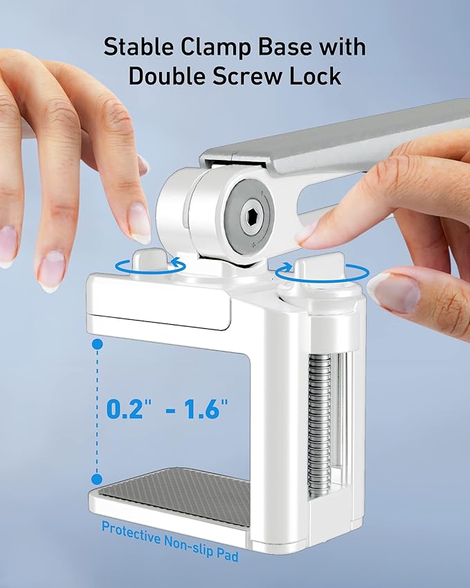 - 【Sturdy and Secure】: This iPad Stand features a strong clamp mount and durable materials for safe and stable device support. The reinforced base fits the countertop/headboard thickness between 0.2" to 1.6" (5 - 40 mm)