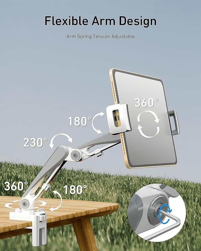 - 【Ergonomic Design】: The adjustable arm of the TA13 iPad Holder allows for customizable viewing angles, making a more comfortable position & better concentration, which is an ideal choice for both work and leisure activities