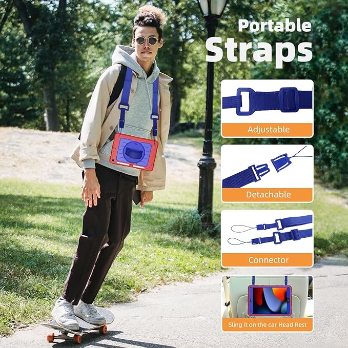 Case for iPad 9th/8th/7th Generation-Built-in Screen Protector,with Pencil Holder & 360°Rotating Hand Strap,Shoulder Strap,Case for iPad 10.2 inch 2021-2019(Red/Blue)