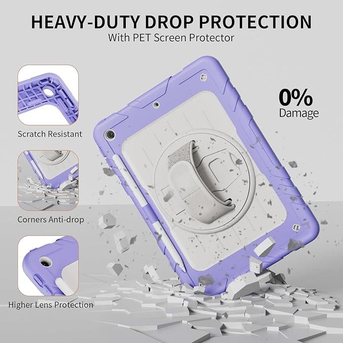 Case for iPad 9th/8th/7th Generation-Built-in Screen Protector,with Pencil Holder&360°Rotating Hand Strap,Shoulder Strap,Case for iPad 10.2 inch 2021-2019(Purple/Beige)