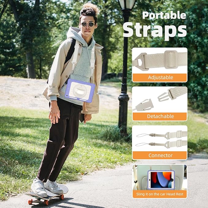 - 【Detachable & Adjustable Shoulder Strap】Attach the strap to any two corner holes of this iPad 10.2 Case.Carry your iPad conveniently wherever you are at home, at work,or on a trip.You can also hang it behind the headrest of the car seat for shared viewing.