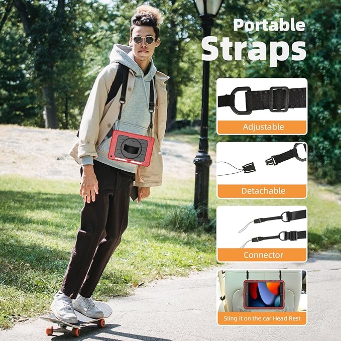 - 【Detachable & Adjustable Shoulder Strap】Attach the strap to any two corner holes of this iPad 10.2 Case.Carry your iPad conveniently wherever you are at home, at work,or on a trip.You can also hang it behind the headrest of the car seat for shared viewing.