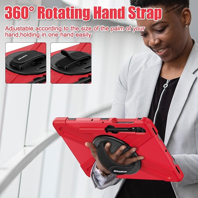 - 360° Rotating Hand Strap & Stand: The Protective Galaxy S10 Plus/Tab S9 FE Plus/ S9 Plus/ S8 Plus/ S7 FE/ S7 Plus 12.4 inch Case built-in 360° Rotatable Hand Strap & Kickstand on the back, flexible in Vertical & Horizontal any other angles ideal for watching video, reading or teaching, maximinzely free your hand. Adjustable Hand Strap perfectly suitable uses for all size of hands, adults, students, child