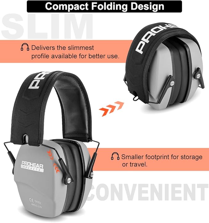 PROHEAR 016 Ear Protection Safety Earmuffs for Shooting, NRR 26dB Noise Reduction Slim Passive Hearing Protector with Low-Profile Earcups, Compact Foldable Ear Defenders for Gun Range, Hunting,Grey