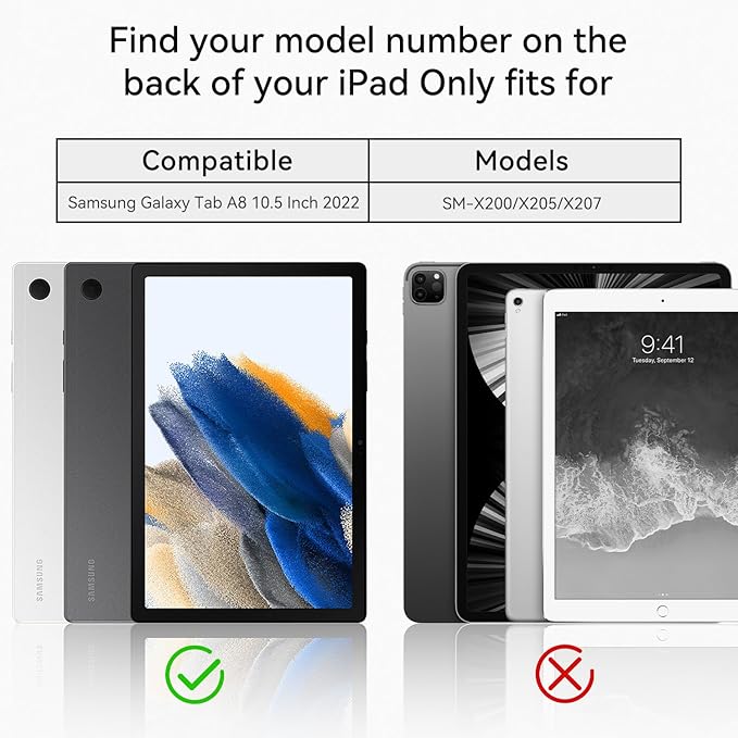 - Compatibility: This case is ONLY Compatible with Samsung Galaxy Tab A8 10.5 inch 2022 Released (Model: SM-X200/X205/X207). NOT compatible with other tablet models. Please confirm the model before purchase. (Please visit SEYMAC Stock to choose the correct case for your tablet.)