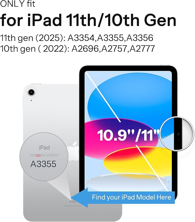 - Compatibility: Only compatible with iPad 11th A16/10th generation (2025-11 inch, 2022-10.9 inch), (models number: A3355 A3356 A2757 A2777 A2696). NOTE: Please remove the inner and outer film before putting on the clear back case