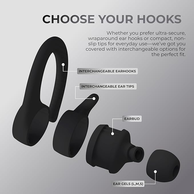 - Choose Your Hooks: Whether you’re looking for ultra-secure, wrap-around ear hooks or more compact, out-and-about, non-slip tips, we’ve got you covered. Both are removable and interchangeable. Your buds, your choice!