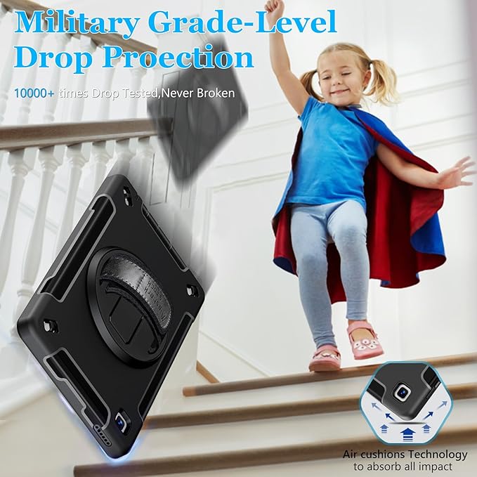 - MATERIAL COMPOSITION: This Case has a built-in screen protector. The inner cover are Made from Hard PC and outer layer Fexible TPU. Our triple defense system has passed the Military Grade Drop Test [MIL-STD 810G-516.6] and can withstand shocks and drops from up to 15 feet, 10,000 times. These shock-absorbent layers incorporate Air Cushion Technology to effectively protect your tablet from accidental drops, bumps, and scratches
