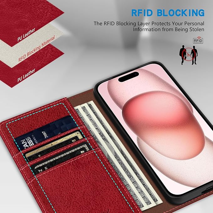 ZZXX for iPhone 15 Wallet Case with [RFID Blocking] Card Slot Stand Strong Magnetic Leather Flip Fold Protective Phone Case for iPhone 15 Case Wallet(Red-6.1 inch)