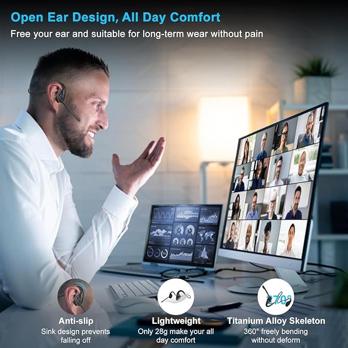 - [Open Ear Design for Comfort] Bluetooth headset with microphone sound can be transmitted precisely through the ear canal into the cochlea, multi-directional restoration of the shape of the music while effectively preventing sound diffusion from affecting others. Open ear design ensures your ears stay open to your surroundings for maximum situational awareness, safety and connection. (NOTE: Not recommended for people with hearing impairments)