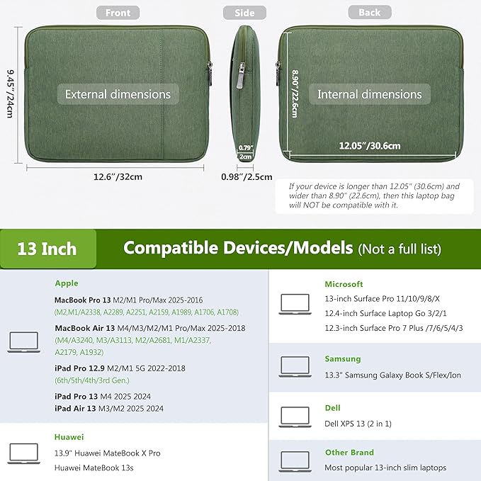 - Internal Dimensions: 12.05" x 8.9" x 0.79". Compatible with MacBook Air 13 M4/M3/M2/M1 2025-2018 (A3240, A3113, A2681, A2337, A2179, A1932), MacBook Pro 13 M2/M1 Pro/Max 2025-2016 (A2338, A2289, A2251, A2159, A1989, A1706, A1708), Dell XPS 13, 13"-12.3" Surface Pro, 12.4" Surface Laptop Go, iPad Pro 13 M4, iPad Air 13 M3/M2, iPad Pro 12.9 2022-2018, Huawei MateBook 13s, 13.9" Huawei MateBook X Pro, 13.3" Samsung Galaxy Book S/Flex/Ion, and most 12"-13" slim laptops/tablets, etc.