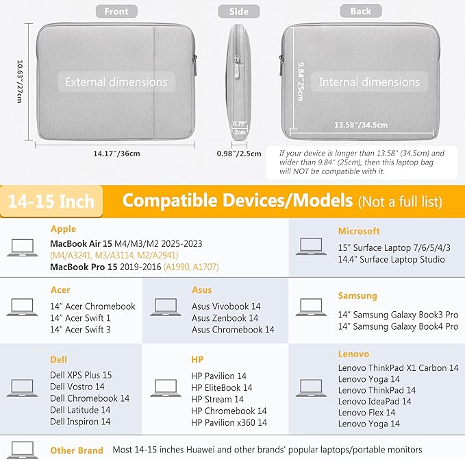 - Internal Dimensions: 13.58" x 9.84" x 0.79". Compatible with MacBook Air 15 M4/M3/M2 2025-2023(A3241, A3114, A2941), MacBook Pro 15 2019-2016(A1990, A1707), 14.4" Surface Laptop Studio, 15" Surface Laptop, HP Pavilion/EliteBook/Stream/Chromebook/Pavilion X360 14, Dell XPS 14/15 Plus, Dell Vostro/Chromebook/Latitude/Inspiron 14, Asus Vivobook/Zenbook/Chromebook 14, 14" Acer Chromebook/Swift 1/3, ThinkPad/IdeaPad/Flex/Yoga 14, ThinkPad X1 Carbon/Yoga 14, 14" Samsung Galaxy Book3/Book4 Pro, etc.