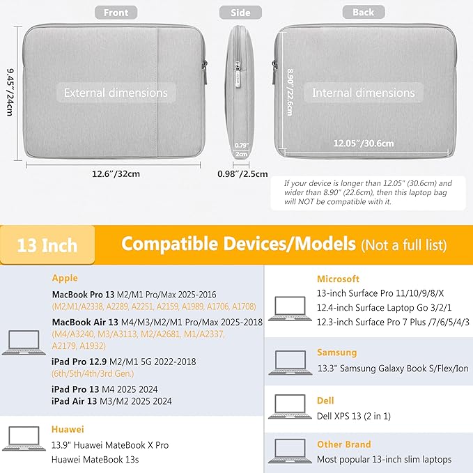 - Internal Dimensions: 12.05" x 8.9" x 0.79". Compatible with MacBook Air 13 M4/M3/M2/M1 2025-2018 (A3240, A3113, A2681, A2337, A2179, A1932), MacBook Pro 13 M2/M1 Pro/Max 2025-2016 (A2338, A2289, A2251, A2159, A1989, A1706, A1708), Dell XPS 13, 13"-12.3" Surface Pro, 12.4" Surface Laptop Go, iPad Pro 13 M4, iPad Air 13 M3/M2, iPad Pro 12.9 2022-2018, Huawei MateBook 13s, 13.9" Huawei MateBook X Pro, 13.3" Samsung Galaxy Book S/Flex/Ion, and most 12"-13" slim laptops/tablets, etc.