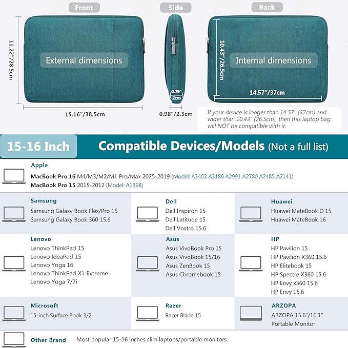 - Internal Dimensions: 14.57" x 10.43" x 0.79". Compatible with MacBook Pro 16 M4/M3/M2/M1 Pro/Max 2025-2019 (A3186 A3403 A2991 A2780 A2485 A2141), MacBook Pro 15 2015-2012 (A1398), HP Pavilion/Elitebook/Envy 15, HP Pavilion/Spectre/Envy X360 15.6, 15" Surface Book, Dell XPS 16, Dell Inspiron/Latitude/Precision/Vostro 15, Samsung Galaxy Book Flex/Pro 15, Asus ZenBook/VivoBook Pro 15, Lenovo IdeaPad/ThinkPad 15, Yoga/ThinkBook 16, VivoBook 15/16, ARZOPA 15.6"/16.1" Portable Monitor, etc.