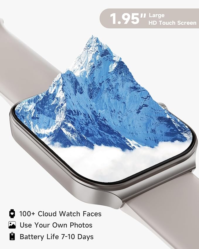 - [1.95'' HD Screen & Customizable Watch Face] Experience crystal-clear visuals like never before with our smartwatch's 1.95-inch high definition screen. Choose from 100 beautiful cloud-based watch faces or even upload your own photos, such as selfies or pictures of your pets, to create a truly personalized look. With endless possibilities, you'll never run out of options to make your watch truly your own.