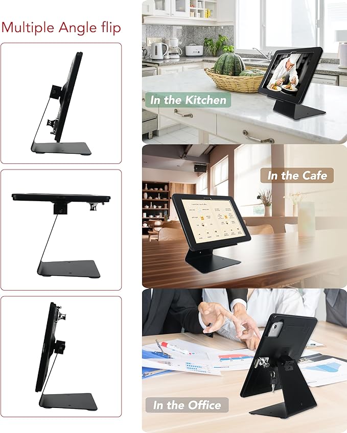 - 3. Strong and stylish aluminum kiosk, predrilled holes in base for secure desktop or installation. lock & Key keeps tablets secured inside the fixed frame, the locking protects tablet from theft.