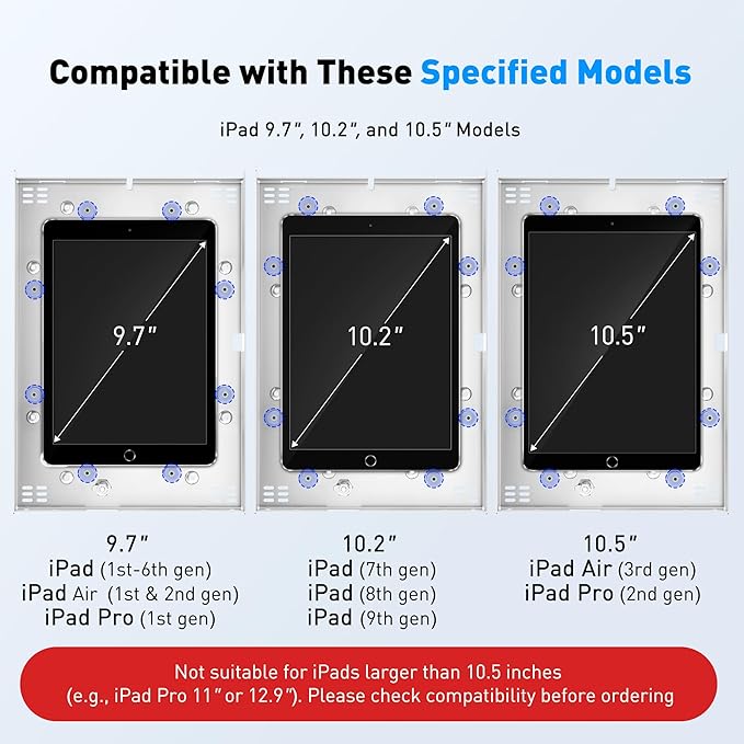 - Compatible iPad Model: This locking tablet stand is designed to fit 9.7" iPad, 10.2" iPad, 9.7" iPad Air, 9.7" iPad Air 2, 10.5" iPad Air, 9.7" iPad Pro and latest 10.5" iPad Pro. The security iPad stand suitable for varied professional needs and environments. Note: Not suitable for iPad models larger than 10.5 inches (e.g., iPad Pro 11-inch or 12.9-inch models). Please check compatibility before placing orders.