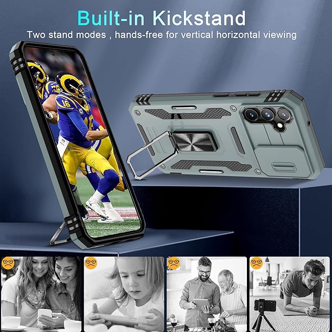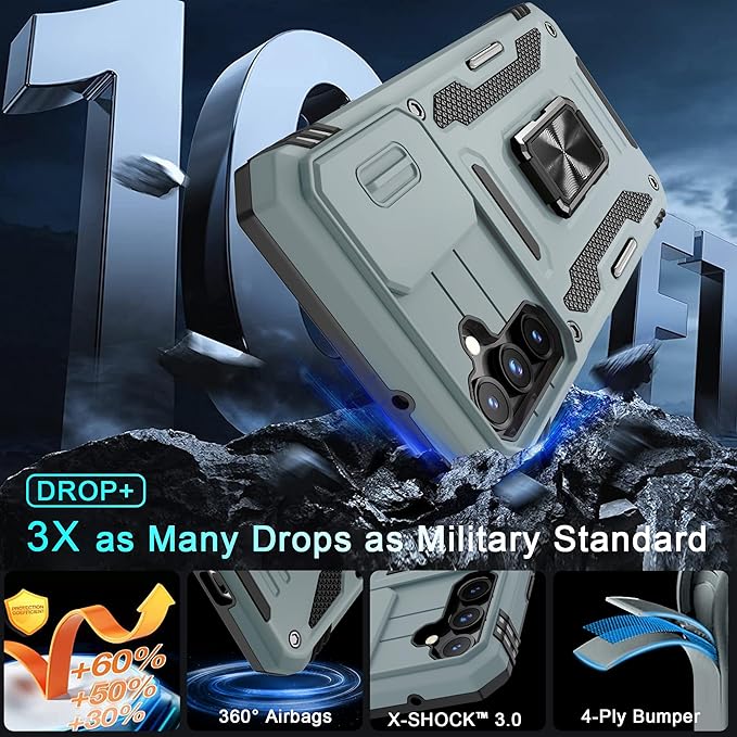 DEERLAMN Case for Samsung Galaxy S23 FE 6.4-Inch with Slide Camera Cover+Screen Protector(1 Pack),Rotated Ring Kickstand Military Grade Shockproof Protective Cover-Grey