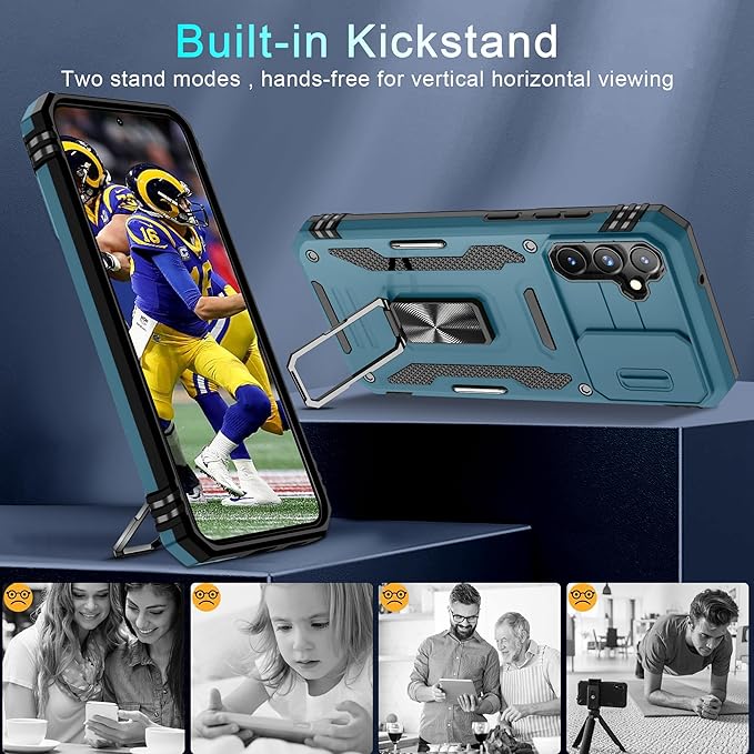 DEERLAMN Case for Samsung Galaxy S23 FE 6.4-Inch with Slide Camera Cover+Screen Protector(1 Pack),Rotated Ring Kickstand Military Grade Shockproof Protective Cover-Light Blue