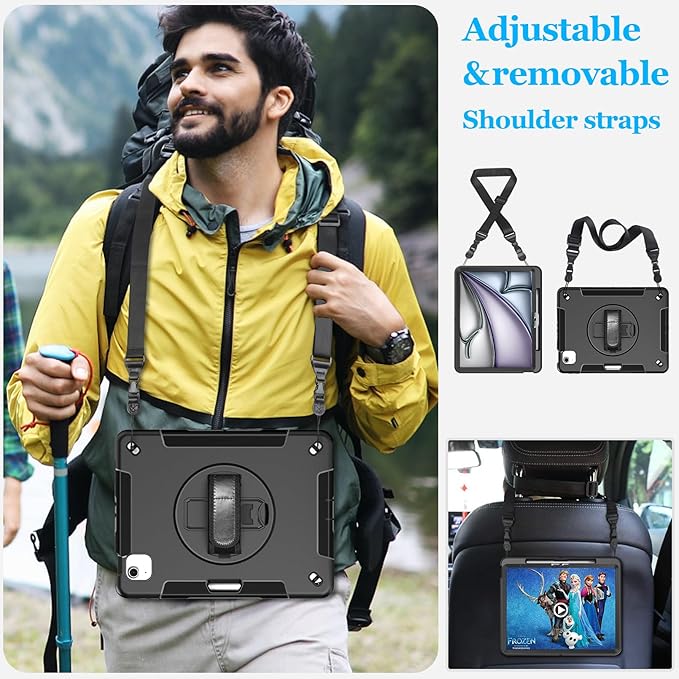 - ADJUSTABLE HAND STRAP + DETACHABLE SHOULDER STRAP: The adjustable hand strap offers easily grip and comfortable hold, it is a must feature when you show your iPad to others. The detachable and adjustable shoulder strap can help you carry your iPad more securely during hiking, traveling other outdoor activities.That can also be used to attach your ipad to the car seat