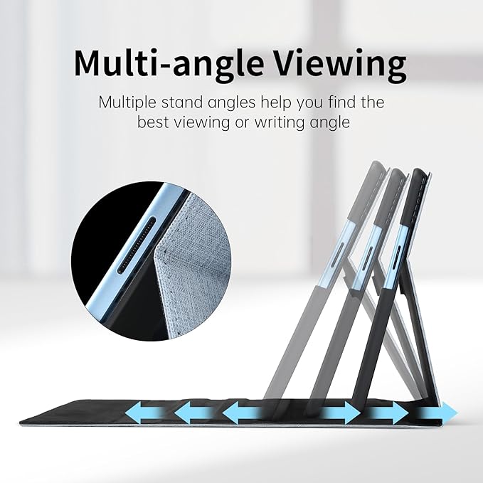 - PRACTICAL INSIDE DESIGN: There are two adjustable stands on the bottom to keep your Surface from slipping, and also still got capacity for your keyboard. The multiple angles created by the stands would protect your vision and spine health, also facilitate typing.