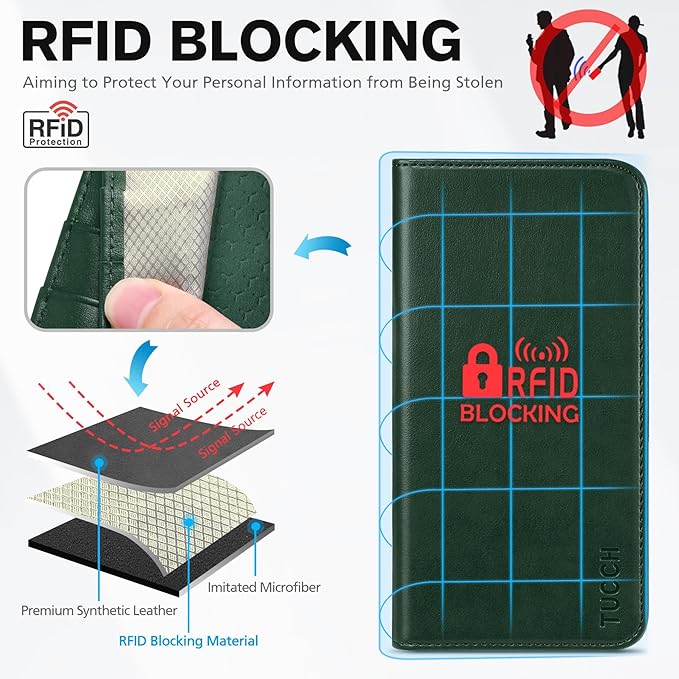 - RFID Blocking: RFID blocking technology application effectively shields the signals and keeps your personal information safe. TUCCH iPhone 15 wallet leather case has RFID blocking protection which can block signals and protect your credit cards from unauthorized scans