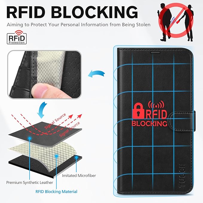 - Highlights: (1). It is supported by advanced RFID blocking technology to block signals and protect your personal information effectively. (2). Can stand the phone up to watch videos or movies. (3). Magnetic flap to keep it closed and protected, secure magnetic closure