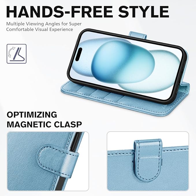 TUCCH Case Wallet for iPhone 15, [RFID Blocking] 4 Card Holder Stand [Shockproof TPU Interior Case] PU Leather Magnetic Protective Flip Cover Compatible with iPhone 15 5G 6.1", Shiny Light Blue