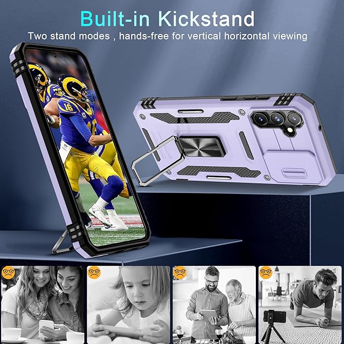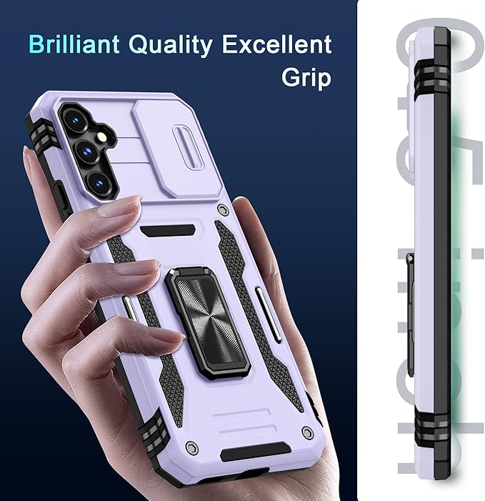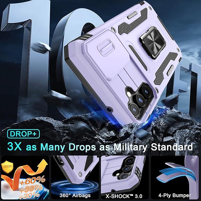 DEERLAMN Case for Samsung Galaxy S23 FE 6.4-Inch with Slide Camera Cover+Screen Protector(1 Pack),Rotated Ring Kickstand Military Grade Shockproof Protective Cover-Light Purple