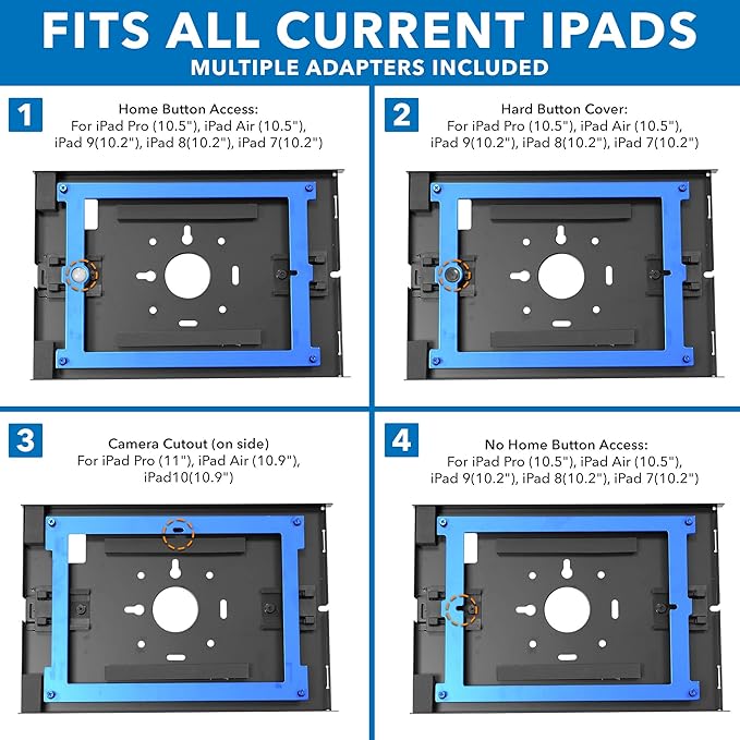 - FITS ALL IPADS: The unique universal enclosure of this iPad kiosk works with a wide range of iPads including the new GENERATION 10 iPads. Compatible tablet models are: iPad Pro (10.5", 11"), iPad Air (10.5", 10.9"), iPad 10 (10.9"), iPad 9 (10.2"), iPad 8 (10.2"), and iPad 7 (10.2"). Weight capacity of 2.2 lbs.