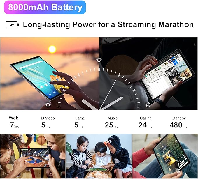 - 【Camera 5MP + 8MP & 8000 mAh】Android 10-inch tablet has a 5MP rear camera and an 8MP front-facing camera that generates stereoscopic vision and utilizes the camera to gain depth of field in images. The stunning 800*1280 IPS display delivers a bright display with richer colors and finer image quality from all angles. The tablet has a large 8000 mAh battery with energy-saving technology that ensures a longer battery life for the tablet, so you don't have to worry about the tablet battery at all.