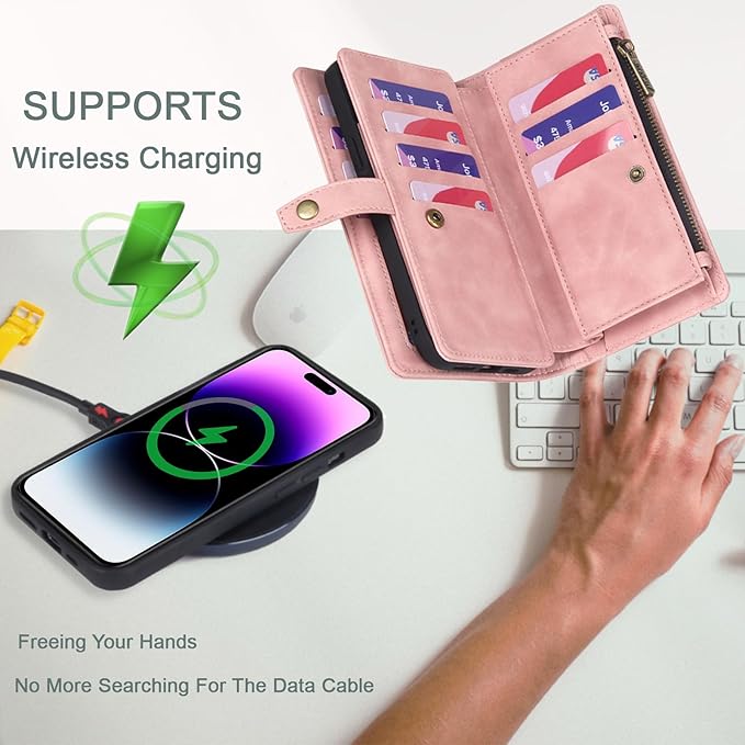 - 【Multi Card Slot Design】TwoHead case wallet compatible with iPhone 15 Pro with 11 card slots,2 cash slots and 1 zipper pocket,there's plenty of room in it for your ID card ,driver license,credit cards,bills,coins and a small amount of cash,which let you keep the essentials organized well. It's a good choice for traveling, shopping and partying.