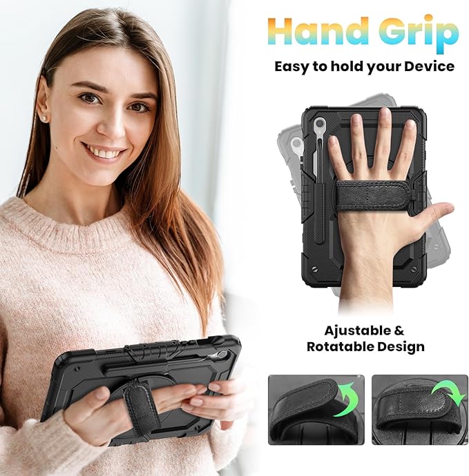 - Built-in 360 Rotatable Kickstand and Hand Strap : 360-degree rotating swivel stand supports position of 3 angles(Vertical, Horizontal, and Halfway between), ideal for watching videos, conferences and travelling. Soft rotating handle strap prevents falling of tab s10 fe 10.9 inch 2025 tablet, featuring convenient use for teachers, students, waiters, doctors, nurses and conference presenters.