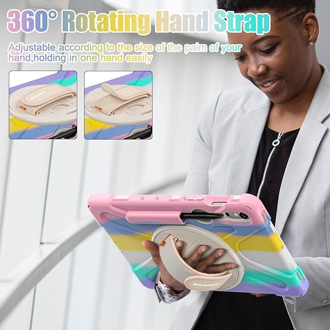 - 360° Rotating Hand Strap & Stand: The Protective Samsung Galaxy Tab S10 Lite/ S10 FE/ S9 FE/ S9/ S8/ S7 Case Built-in 360° Rotatable Hand Strap & Kickstand on the back, flexible in Vertical & Horizontal any other angles ideal for watching video, reading or teaching, maximinzely free your hand. Adjustable Hand Strap perfectly suitable uses for all size of hands, adults, students, child