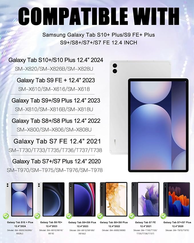 - Compatibility: The case is compatible with 12.4 inches tablets: Samsung Galaxy Tab S10+/S10 Plus 2024(Model: SM-X820/ X826B/ X828U), Samsung Galaxy Tab S9 FE+ /S9 FE Plus 2023 (Model: SM-X610/X616/X618), Samsung Galaxy Tab S9 Plus/S9+ 12.4 Inch 2023 (Model: SM-X810/ X816B/ X818U), Samsung Galaxy Tab S8 Plus/S8+ 12.4 Inch 2022 (Model: SM-X800/ X806/X808U), Samsung Galaxy Tab S7 FE 5G 12.4 Inch 2021 (Model: SM-T730/ T733/ T735/ T736/ T738), Samsung Galaxy Tab S7 Plus/S7+ 12.4 Inch 2020 (Model: SM-T970/ T975/ T976/ T978), it doesn't fit any other tablet. Especially NOT fit 11 inch Samsung Galaxy Tab S9 or 10.9 inch Samsung Galaxy Tab S9 FE/S10 FE