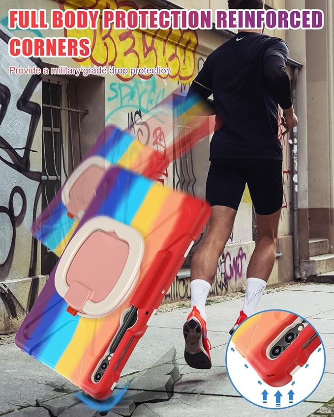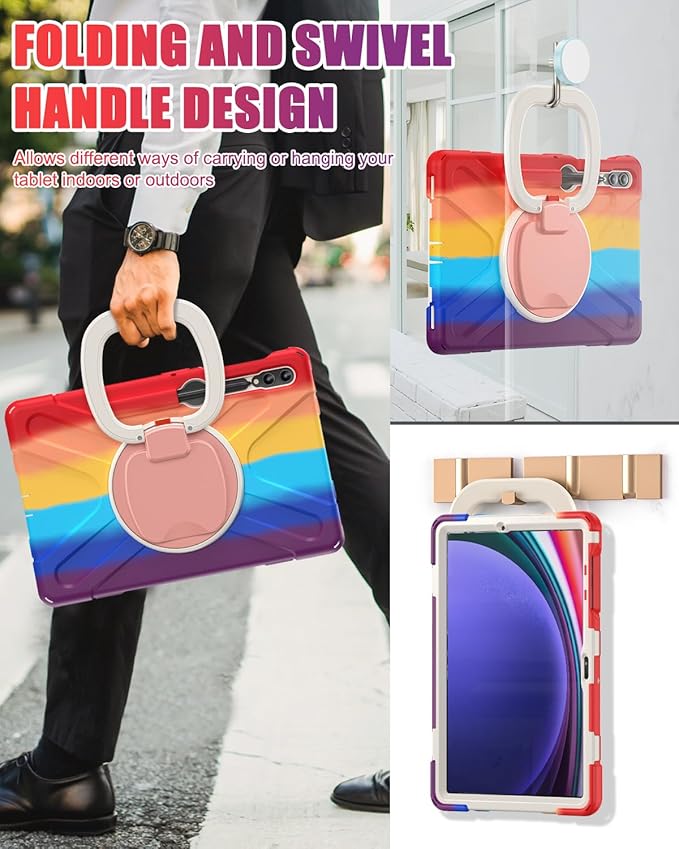 - Functionality: 360°rotating +180°folding Grip can be used as a handle, easy to hang your Samsung galaxy tab S9 Plus case in kitchen, washroom, bedroom; Kickstand is stable enough to stand on different surfaces for children to view. Button and port cover enable to prevent dust, it also support S Pen Charging