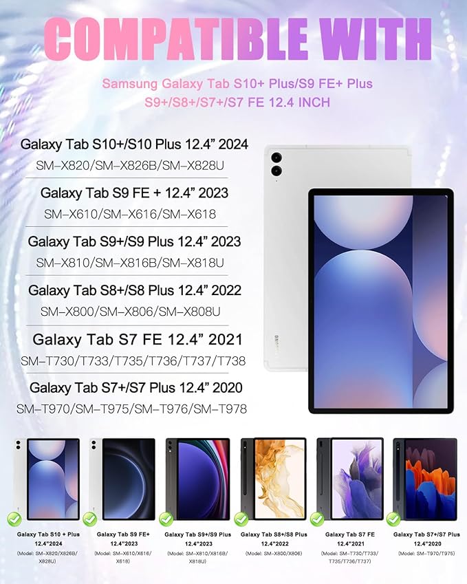 - Compatibility: The case is compatible with 12.4 inches tablets: Samsung Galaxy Tab S10+/S10 Plus 2024(Model: SM-X820/ X826B/ X828U), Samsung Galaxy Tab S9 FE+ /S9 FE Plus 2023 (Model: SM-X610/X616/X618), Samsung Galaxy Tab S9 Plus/S9+ 12.4 Inch 2023 (Model: SM-X810/ X816B/ X818U), Samsung Galaxy Tab S8 Plus/S8+ 12.4 Inch 2022 (Model: SM-X800/ X806/X808U), Samsung Galaxy Tab S7 FE 5G 12.4 Inch 2021 (Model: SM-T730/ T733/ T735/ T736/ T738), Samsung Galaxy Tab S7 Plus/S7+ 12.4 Inch 2020 (Model: SM-T970/ T975/ T976/ T978), it doesn't fit any other tablet. Especially NOT fit 11 inch Samsung Galaxy Tab S9 or 10.9 inch Samsung Galaxy Tab S9 FE/S10 FE