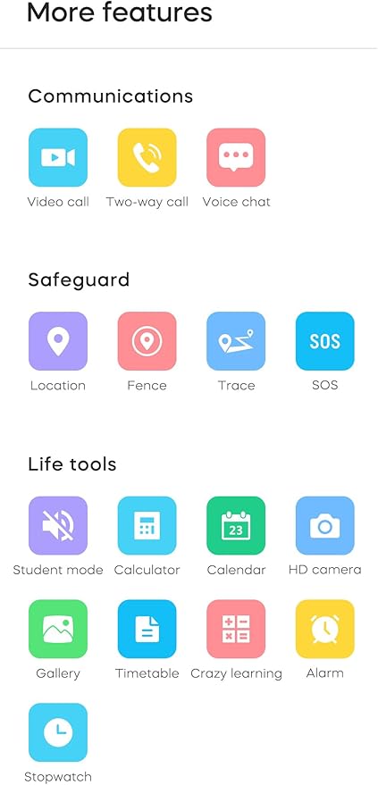 - Special Feature : Facebook, TikTok, Silent Mode, Waterproof, Touch screen, Math game, Geo-fence, Two way phone call, HD Video Call, SOS Alarm Calling, Voice chat, Text message, GPS+WiFi+LBS Multiple tracker mode, Text Messaging, 4G Global location, Real time gps tracking, Pedometer, History route, WhatsApp, Line Facebook, TikTok, Silent Mode, Waterproof, Touch screen, Math game, Geo-fence, Two way phone call, HD Video Call, SOS Alarm Calling, Voice chat, Text message, GPS+WiFi+LBS Multiple tracker mode, Text Messaging, 4G Global lo… See more
